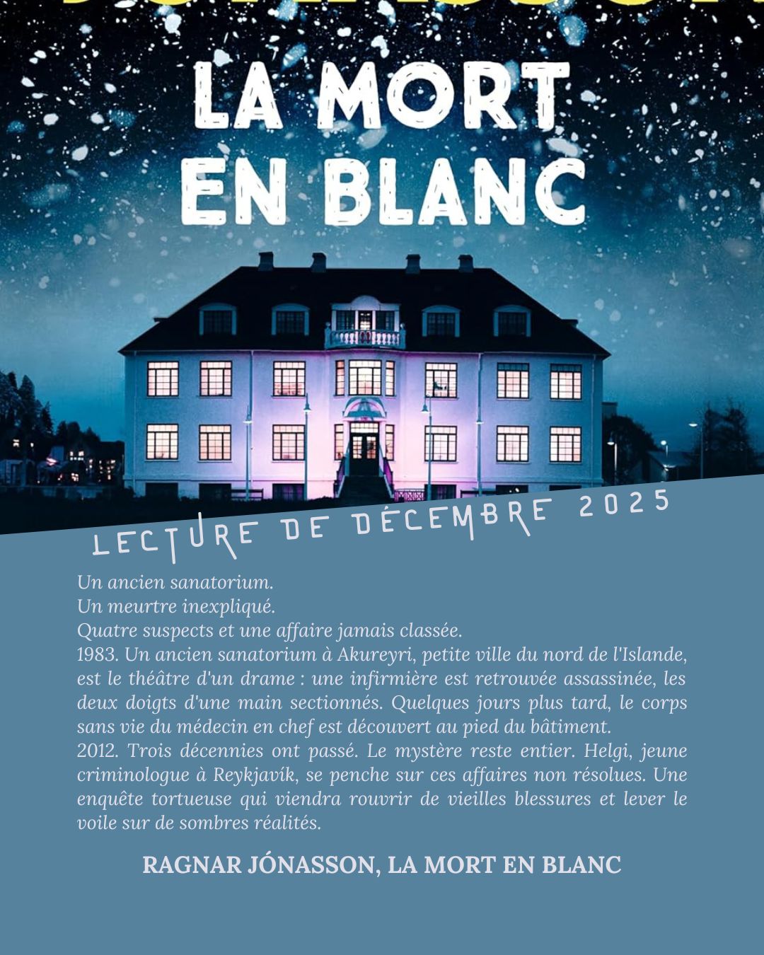 « L’affaire l’avait intrigué en partie à cause de son lien avec sa ville natale d’Akureyri, dont les habitants connaissaient bien les imposants bâtiments de l’ancien sanatorium ; il avait entendu parler des morts survenues là-bas longtemps avant d’avoir décidé d’y consacrer ses recherches. Au cours de ses études, il avait eu l’idée d’utiliser son mémoire comme une occasion de creuser un peu l’affaire. Avec le recul, l’enquête de l’époque soulevait beaucoup de questions, et le mobile demeurait délicieusement obscur. Armé des théories apprises durant son cursus de criminologie, Helgi voulait mener une analyse rigoureuse et scientifique d’une des affaires de meurtre les plus marquantes de ces dernières décennies en Islande.Mais ce qui le fascinait le plus dans ces « morts du sanatorium », c’était que trente ans après, pour autant qu’il sache, le mystère n’était toujours pas résolu. »