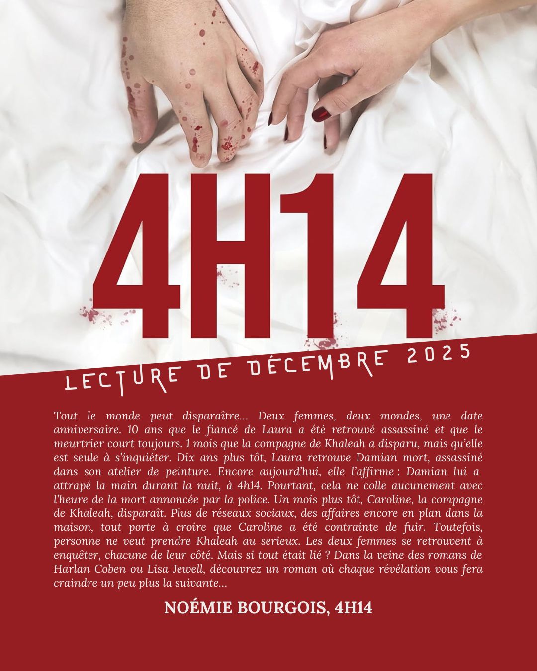 Je n’ai pas ressenti cela avec « 4h14 ». C’est un thriller « modeste » (ce n’est pas péjoratif), pas exceptionnel dans le fond ou dans la forme, mais qui fonctionne bien. Ce livre m’a davantage fait penser à un roman à suspense qu’à un thriller, notamment concernant le traitement de l’intrigue. Plusieurs protagonistes aux destins croisés, des amitiés loyales et des adversaires dangereux, prêts à tout pour arriver à leur fin. Et plus on effeuille les différentes couches du mystère, plus sa noirceur prend forme. Les personnages manquent peut-être de nuance, mais cela ne m’a pas gênée outre mesure. Je me suis facilement laissée prendre par l’histoire, d’autant qu’elle est bien rythmée, et j’ai passé un bon moment avec cette dernière lecture de l’année 2025.