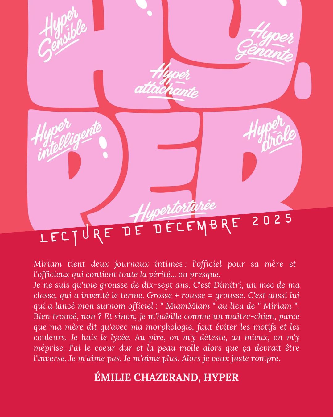 J’ai adoré cette lecture ! On y suit Miriam, une adolescente qui cache son mal-être derrière une ironie mordante. Moquée par ses camarades pour sa grande taille et ses rondeurs, elle s’est forgée une carapace. Alors qu’elle se découvre, au fil des pages, on comprend que son histoire est complexe, une cicatrice béante qui peine à se refermer.
