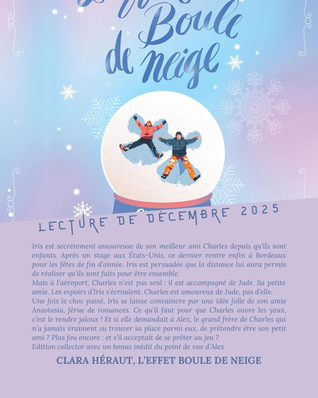 Ce roman aura été mon unique lecture Noëlesque de décembre et je me suis régalée, comme toujours avec Clara Héraut, et comme toujours avec Violette Erhart (la narratrice du livre audio). Si vous avez déjà lu des romans de cette autrice, vous savez de quoi je parle. J’en ai lu trois, et je les ai tous aimés. Alors, si vous n’avez pas encore trouvé votre bonheur parmi les romances de Noël, il n’est pas trop tard !